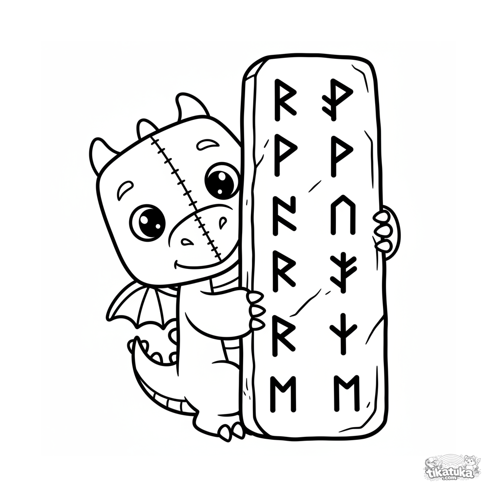 Página para colorir para crianças pequenas 2-3: um wyvern de pelúcia fofo espreita por trás de uma grande pedra rúnica. Formas muito simples e grandes como um brinquedo, áreas amplas e limpas.