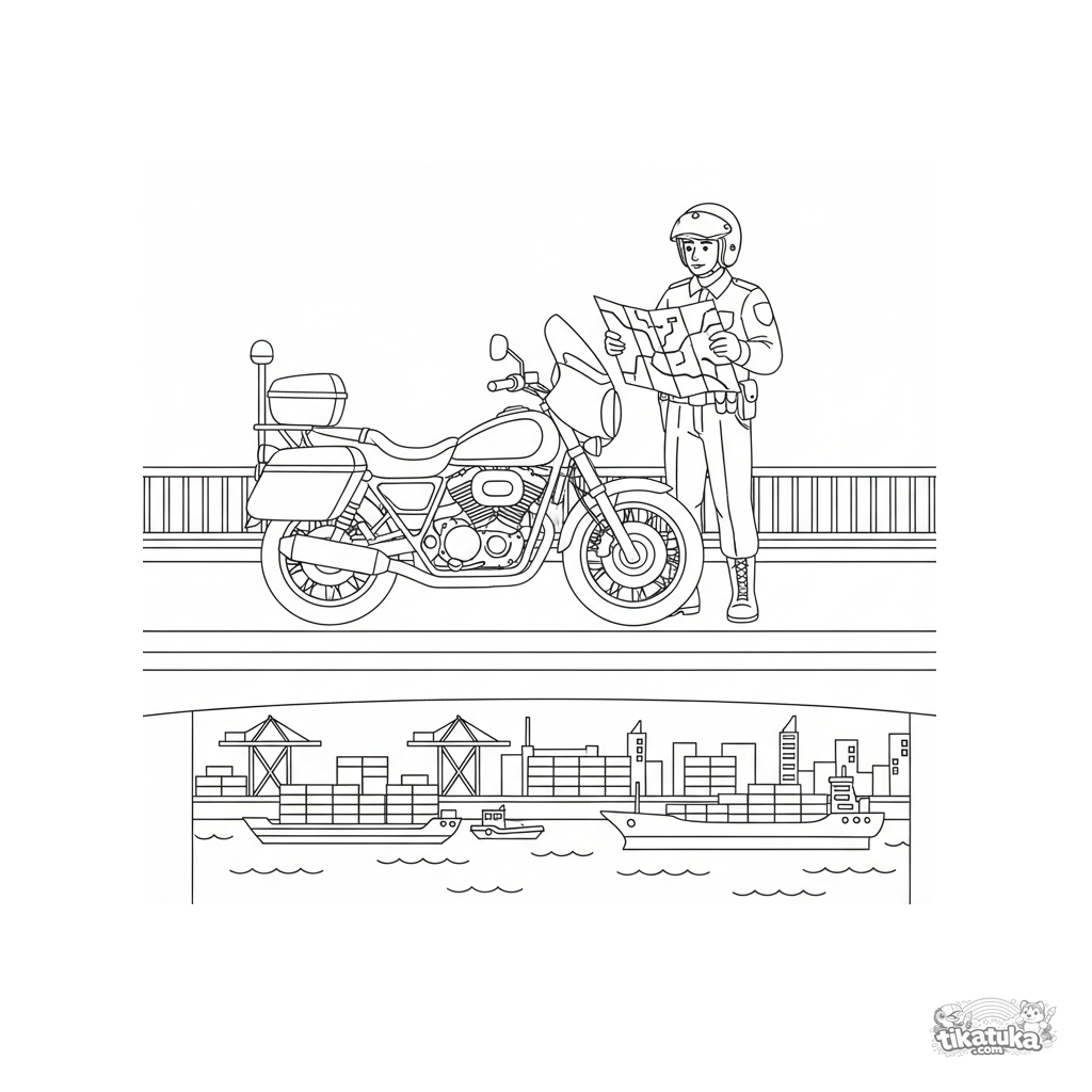Página para colorir para 7-9 anos: uma moto policial em patrulha em uma ponte. Cena detalhada com figura de oficial.