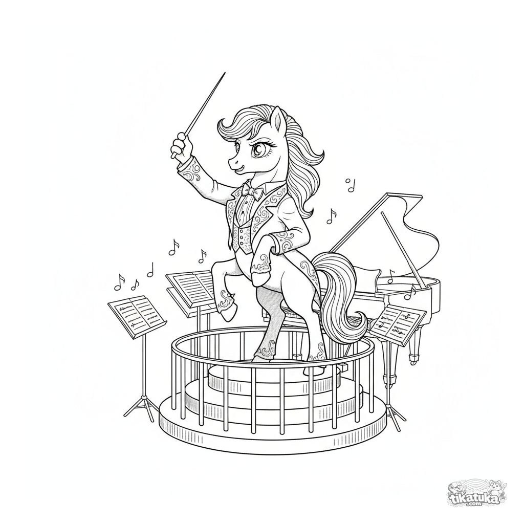 Página para colorir detalhada estilo gravura vintage de um pônei maestro no fosso da orquestra de um teatro. Para crianças de 10 a 12 anos. Cena com pódio e partituras.