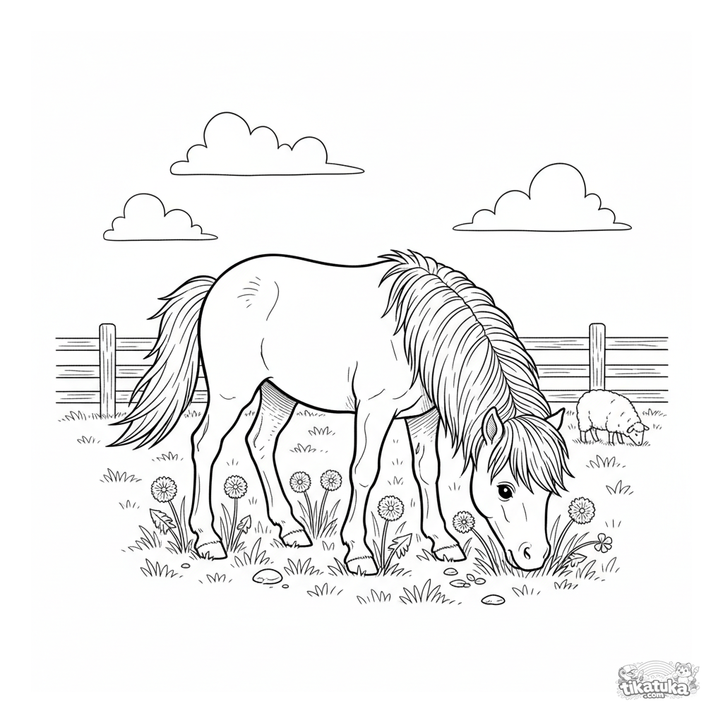 Página para colorir crianças: um fofo potro pastando em um pasto verde de fazenda, comendo dentes-de-leão. Estilo gravura leve, cena pacífica.