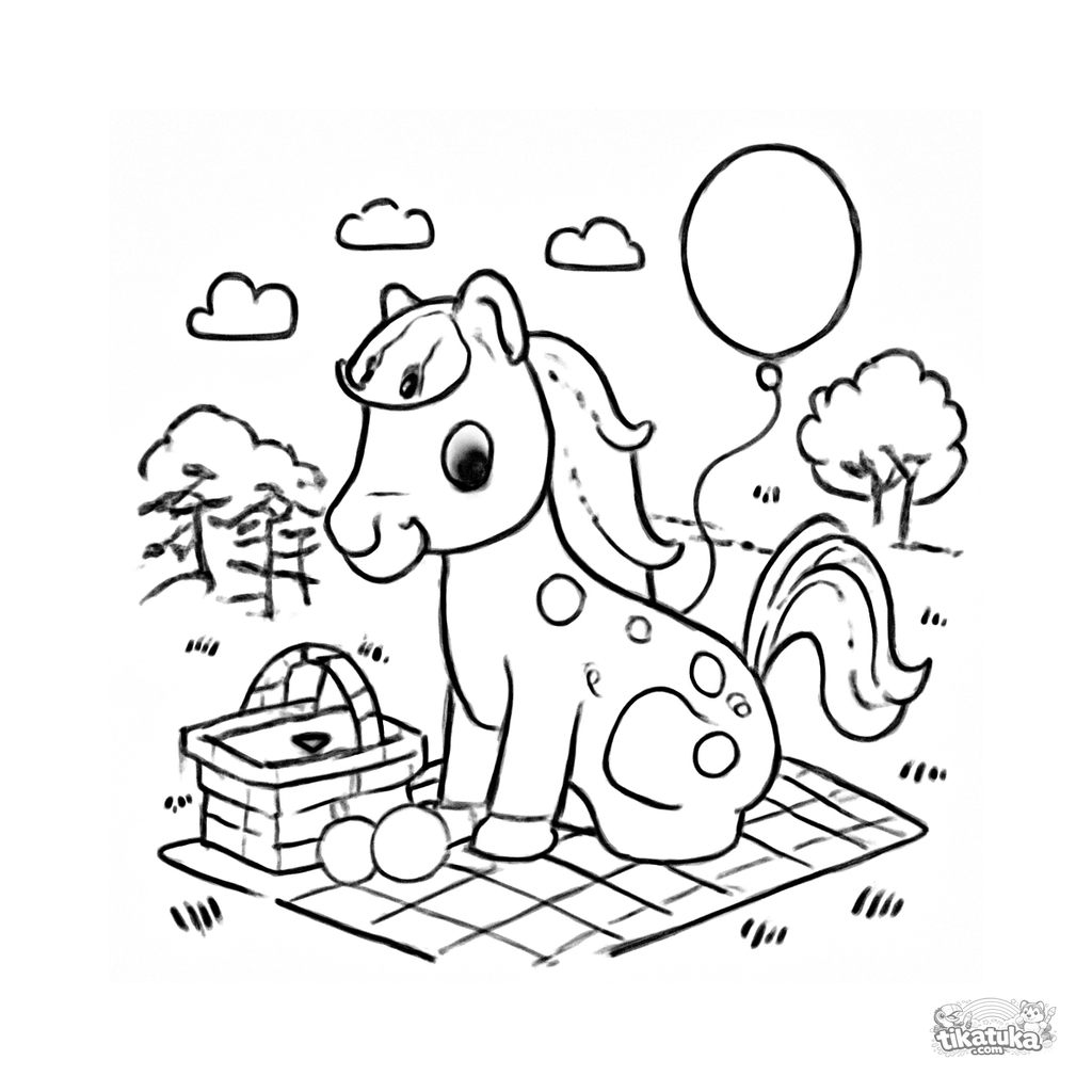 Página para colorir para crianças. Um pônei malhado sentado em uma manta xadrez com cesta de piquenique, sanduíches, frutas e balão amarrado no rabo. Download grátis.