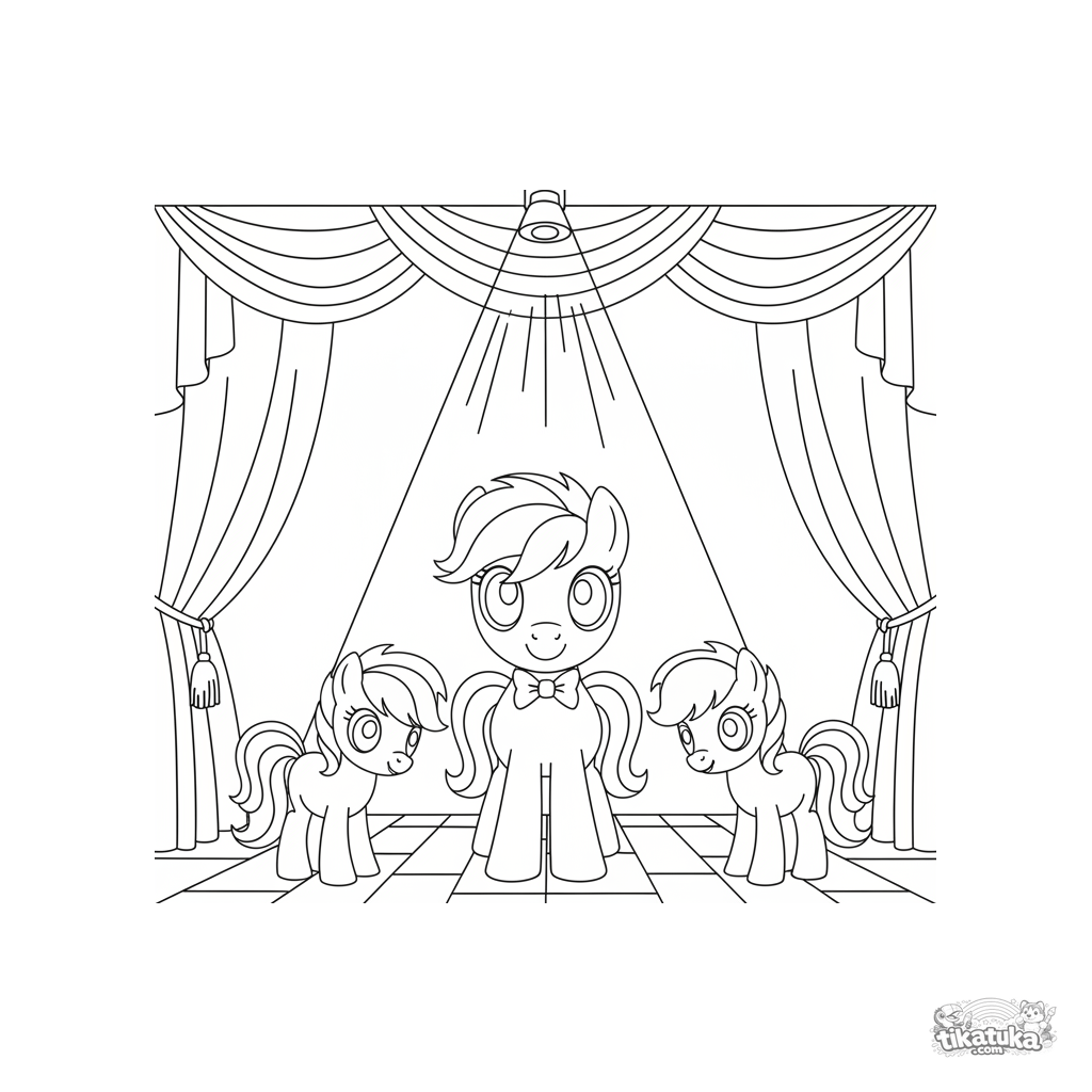 Página para colorir para crianças de 4-6 anos: três pôneis fazendo reverência juntos no palco no final do espetáculo. Figuras claras, cortina teatral.