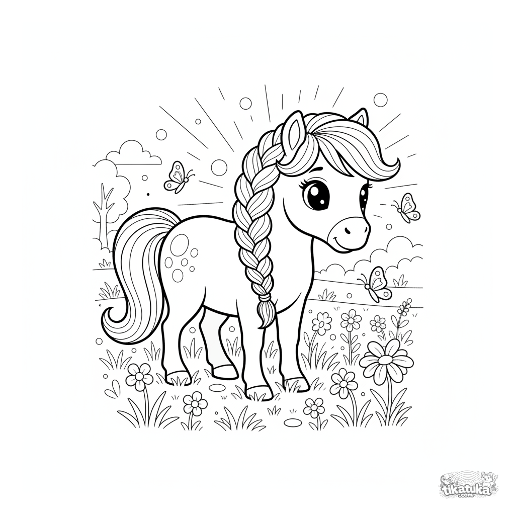 Página para colorir para meninas de 4-6 anos: um pônei fofo com crina trançada pasta num campo cheio de flores silvestres e borboletas. Cena pacífica.
