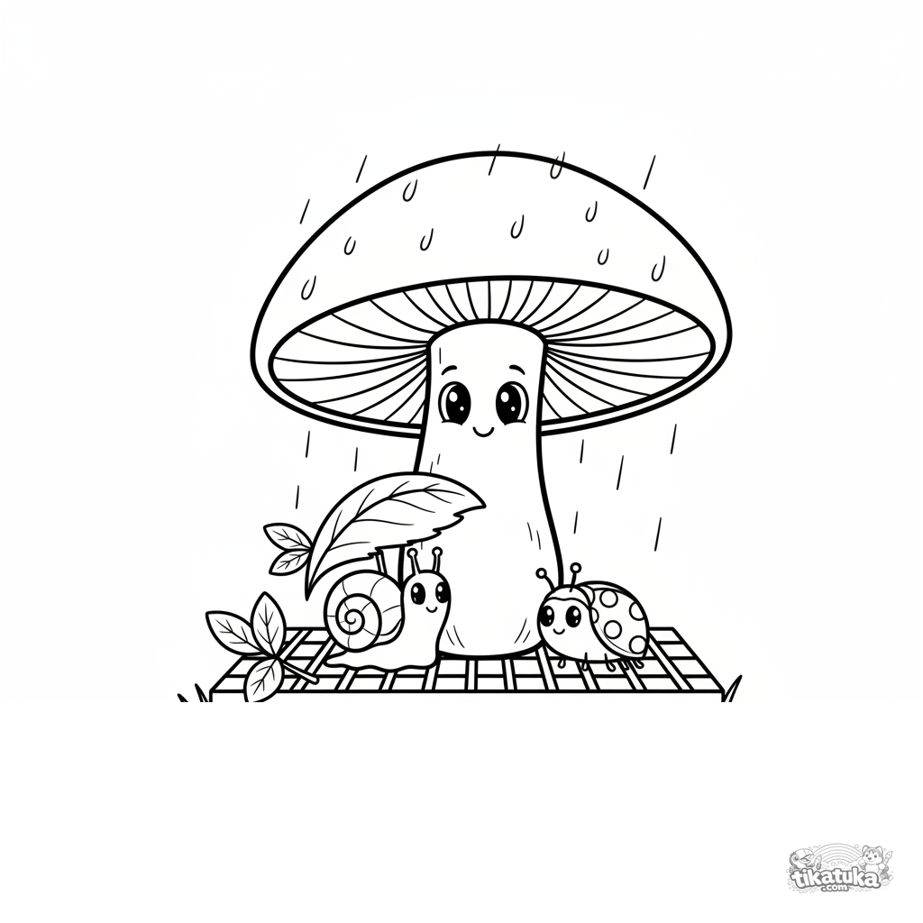 Página para colorir de um cogumelo portobello em uma grelha de jardim servindo de guarda-chuva para um caracol e uma joaninha. Para 4-6 anos.