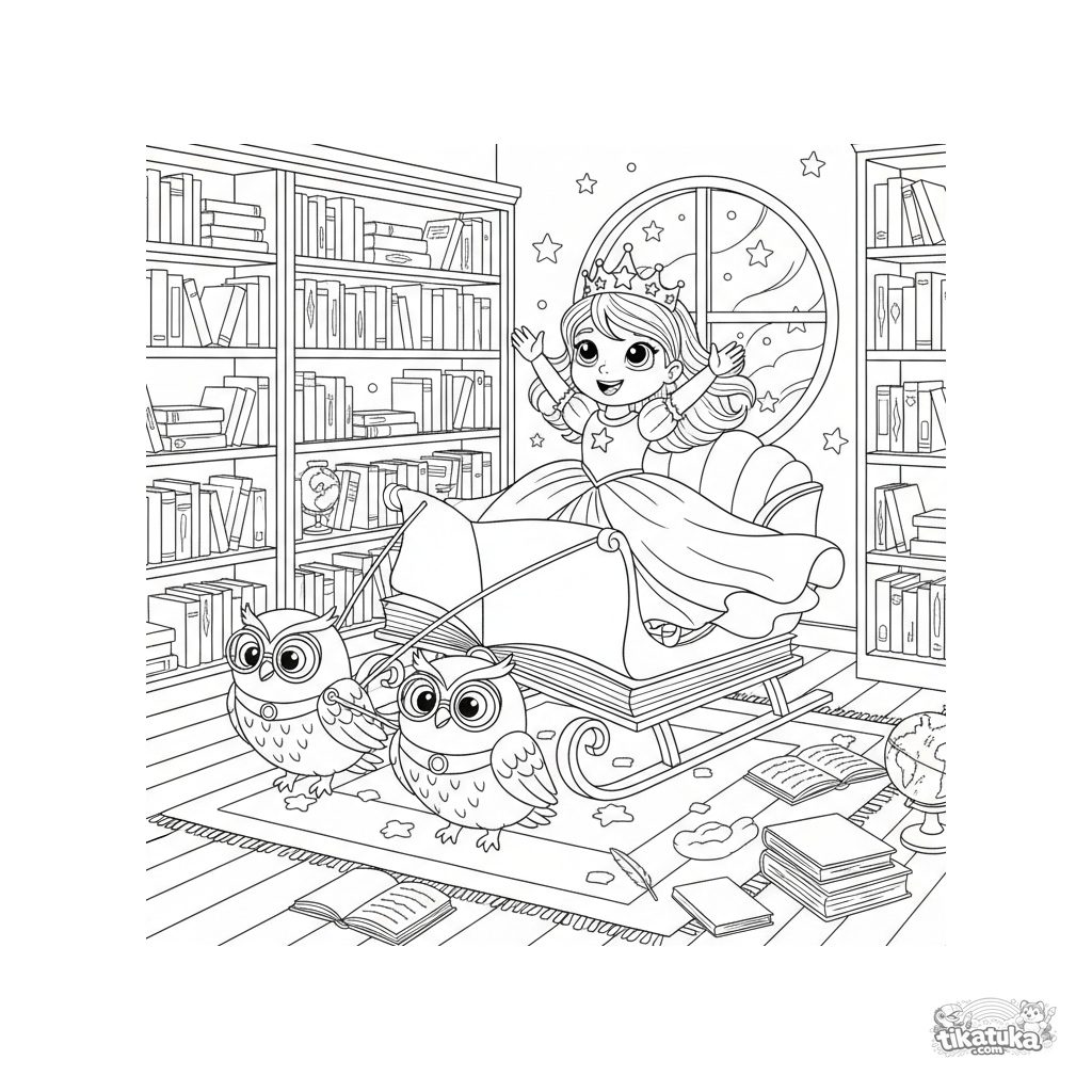 Página para colorir para meninas 4-6 anos: uma princesa mágica viaja em um trenó de livro por uma biblioteca, puxado por corujas. Cena imaginativa.