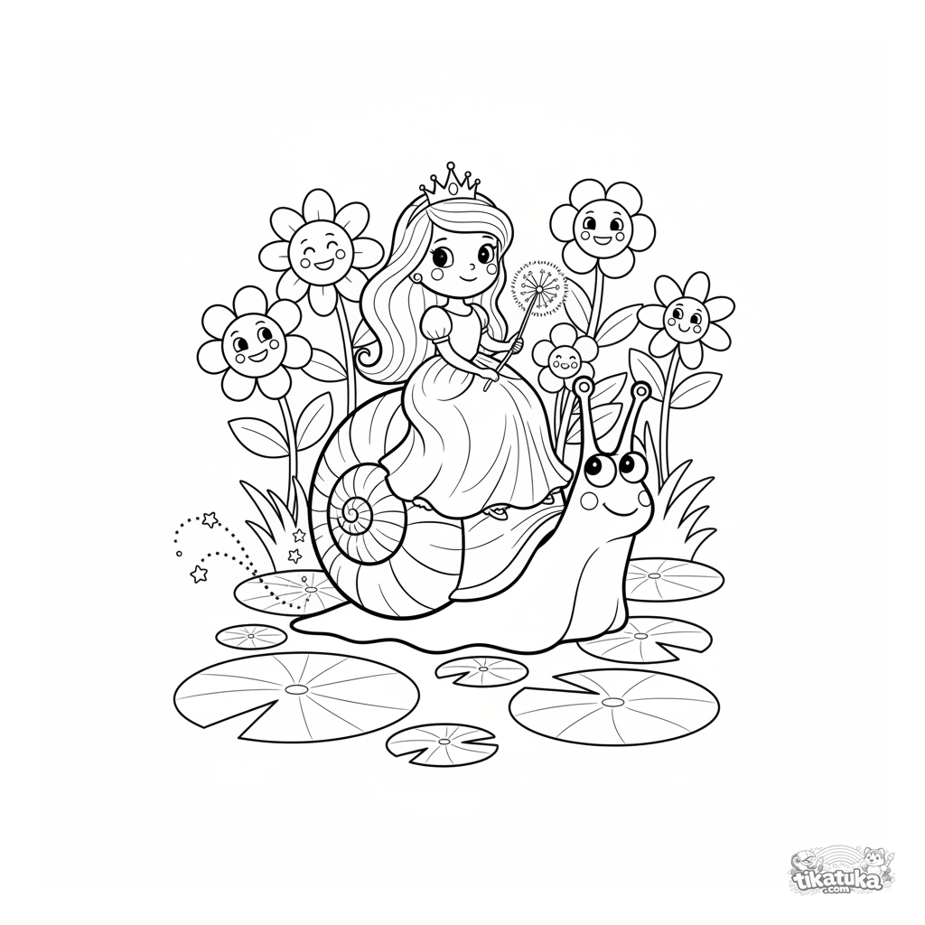 Página para colorir para crianças de 4-6 anos: uma princesa monta um caracol gigante por um jardim encantado. Cena de conto de fadas com flores sorridentes.