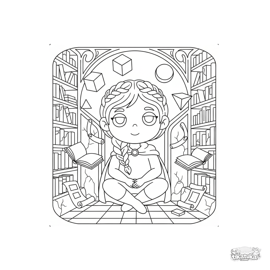 Página para colorir para pré-adolescentes 7-9: um herói psíquico flutua em uma biblioteca antiga em ruínas, com formas geométricas e pergaminhos orbitando ao seu redor.
