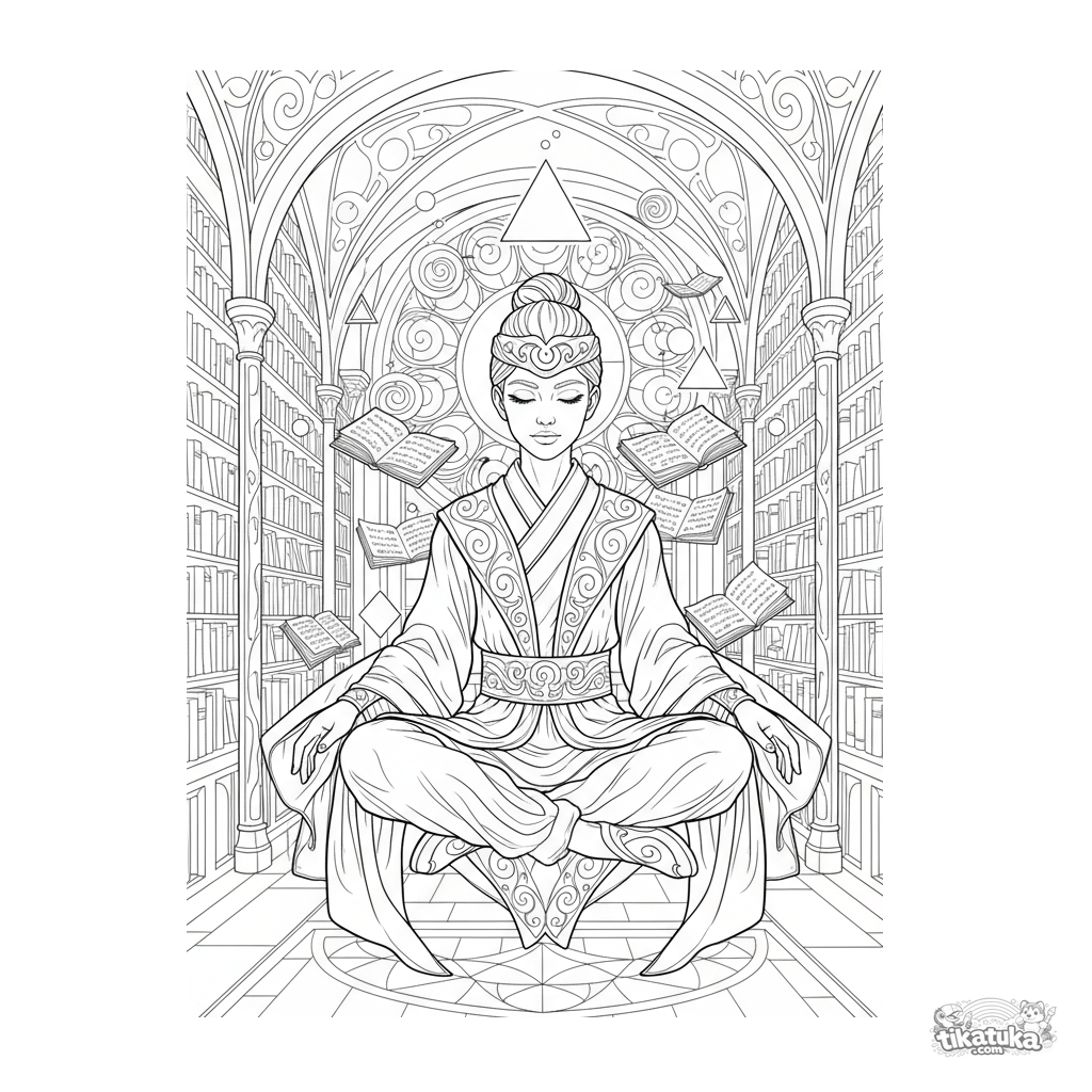 Página complexa para colorir para 10-12 anos: um herói psíquico medita flutuando em uma biblioteca antiga, cercado por livros e formas geométricas orbitantes. Cena serena e detalhada.
