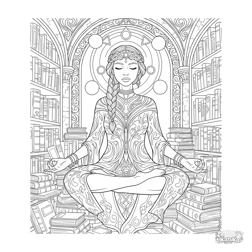 Página para colorir para crianças mais velhas de 10-12 anos: um super-herói psíquico medita flutuando entre prateleiras altas de livros antigos em uma biblioteca de pedra.