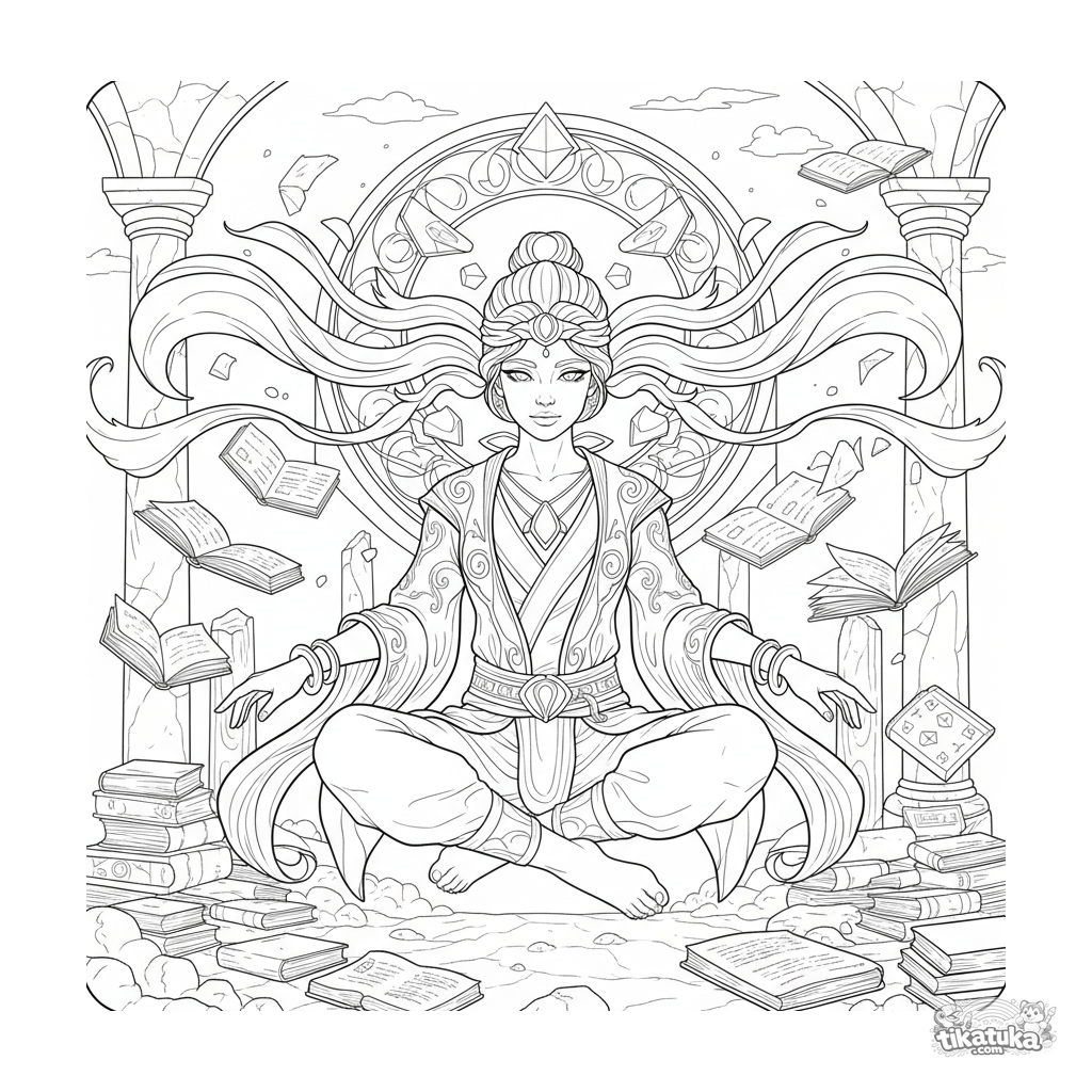 Página detalhada para colorir para 10-12 anos: um super-herói com poderes psíquicos medita entre ruínas de biblioteca, cercado por livros flutuantes.