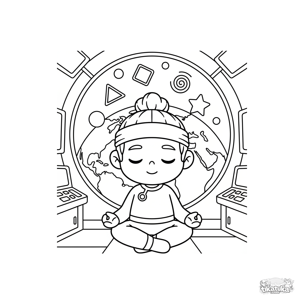 Página para colorir para 7-9 anos: um super-herói psíquico medita em gravidade zero dentro de uma estação espacial, com formas geométricas flutuando. Cena futurista calma.