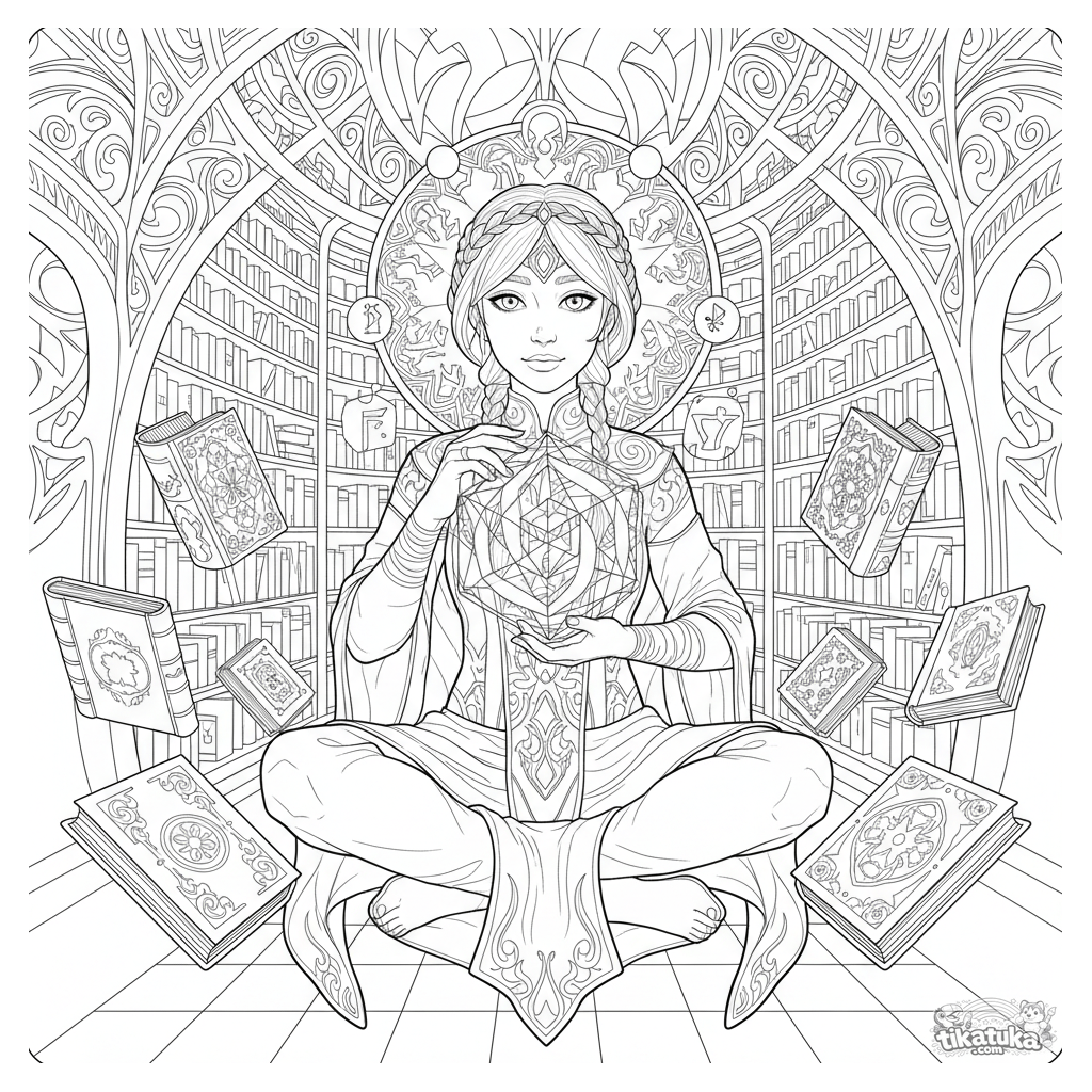 Página para colorir para crianças maiores 10-12: um super-herói psíquico usa poderes mentais para montar um quebra-cabeça luminoso em uma biblioteca flutuante. Detalhes intrincados.