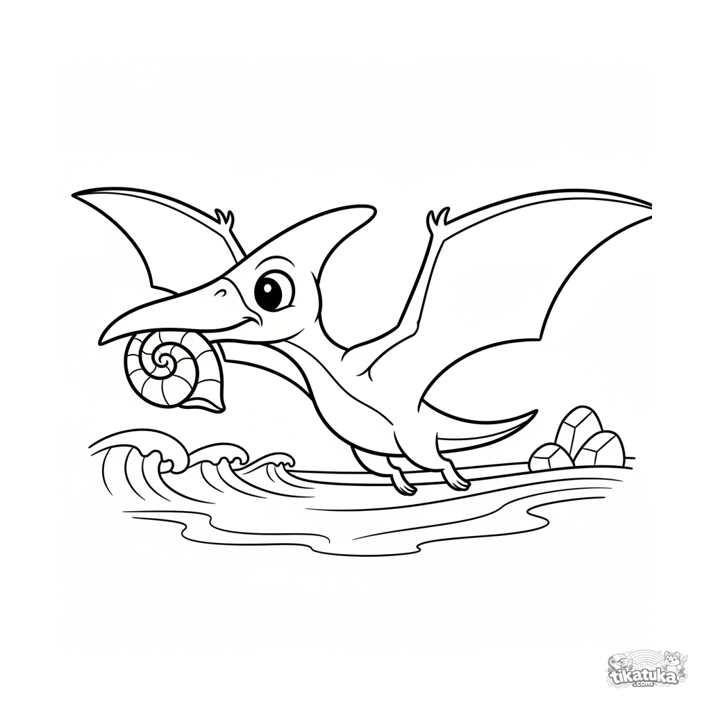 Página para colorir para 7-9 anos: um pterodáctilo planando sobre uma praia antiga, carregando uma concha grande e brilhante no bico. Cena dinâmica em estilo de recorte de papel.