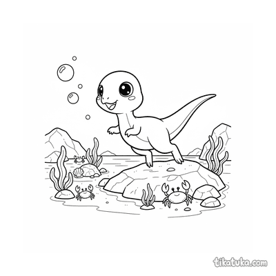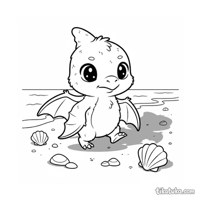 Página detalhada para colorir para crianças de 10-12 anos: um pterossauro pescando em uma poça de maré na praia de um oceano antigo.