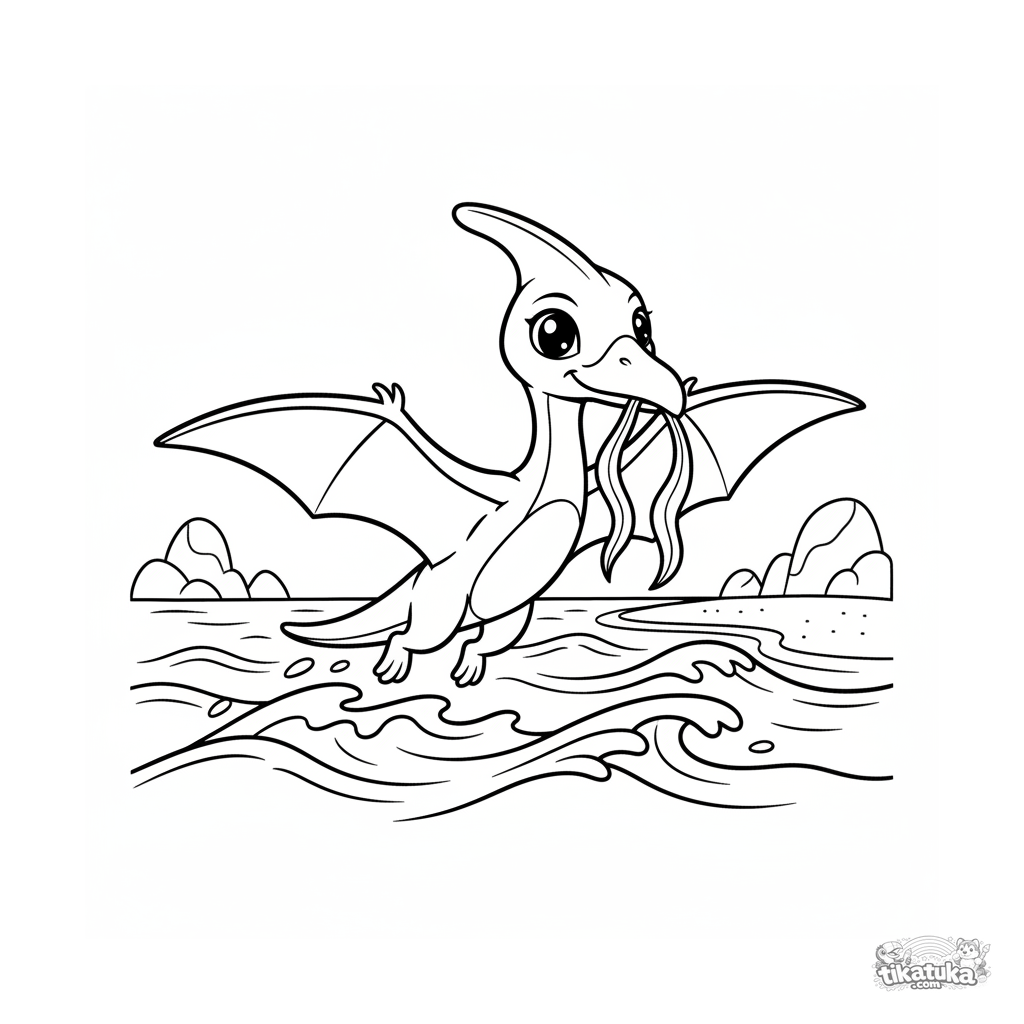 Página para colorir para 7-9 anos: um pterossauro plana sobre um oceano antigo, carregando algas no bico. Cena dinâmica em estilo de recorte de papel.