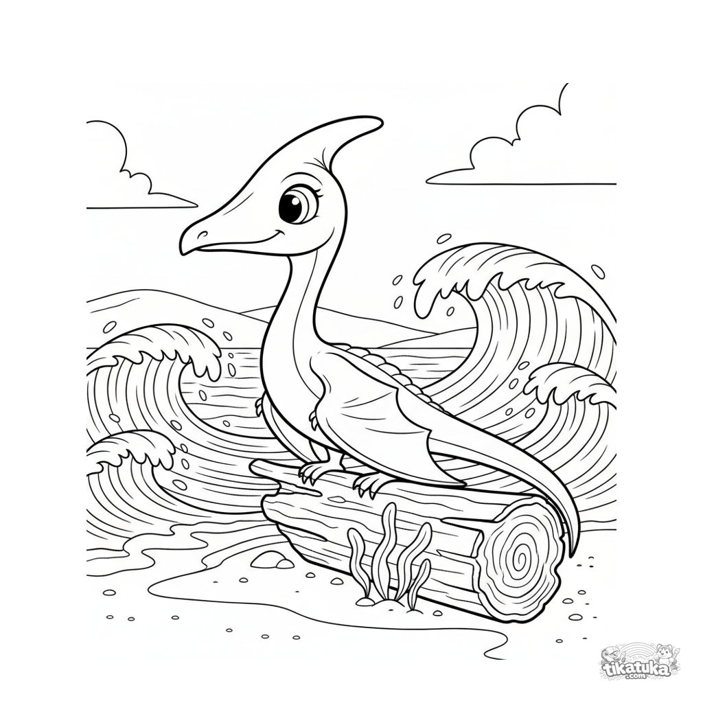 Página para colorir para 7-9 anos: um pterossauro empoleira-se em madeira à deriva, observando as ondas de um oceano antigo. Cena estilo livro ilustrado com algas.