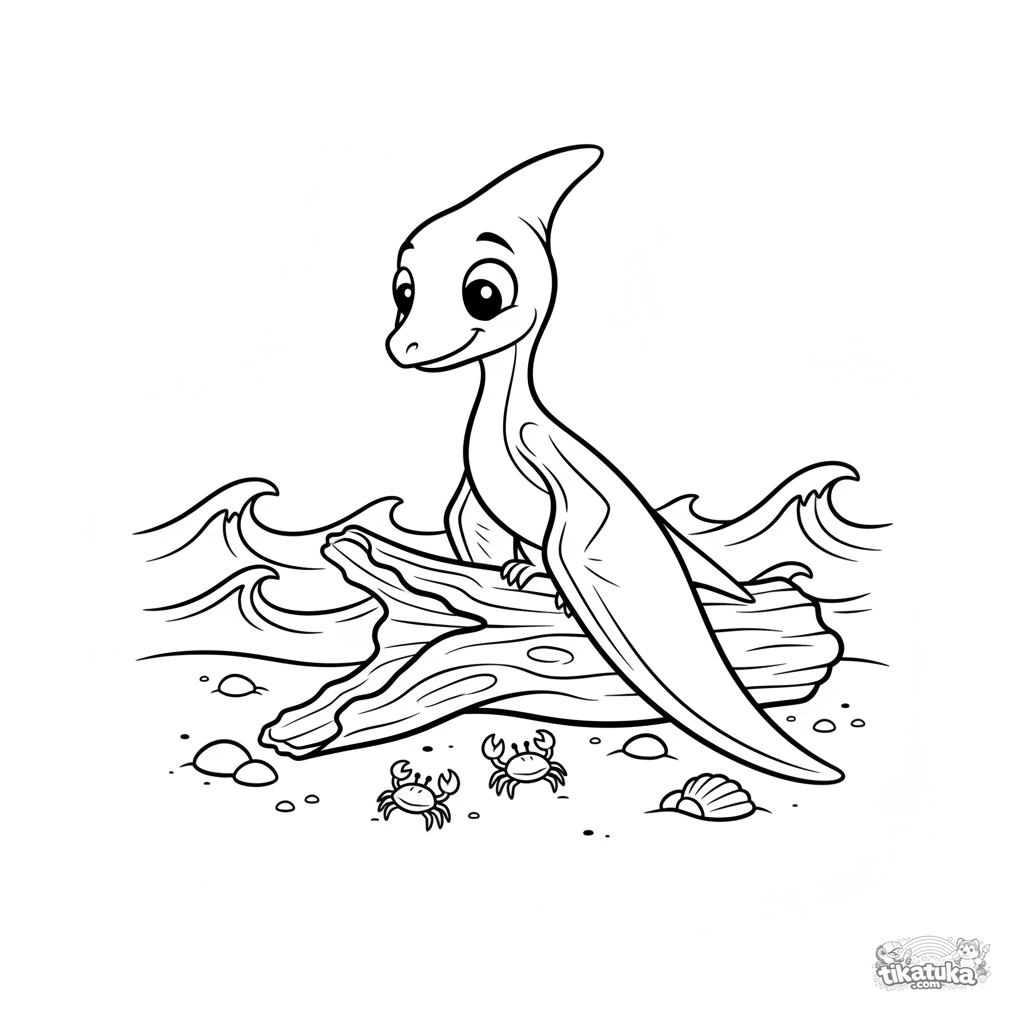 Página para colorir para 7-9 anos: um pterossauro empoleira-se em madeira à deriva na costa arenosa de um oceano antigo, observando caranguejos. Estilo de recorte de papel.