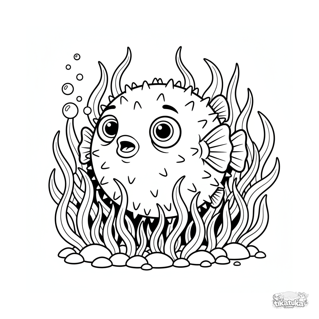 Página para colorir de um baiacu surpreso inflado em um leito de ervas marinhas ensolarado. Para 7-9 anos, emoções expressivas.