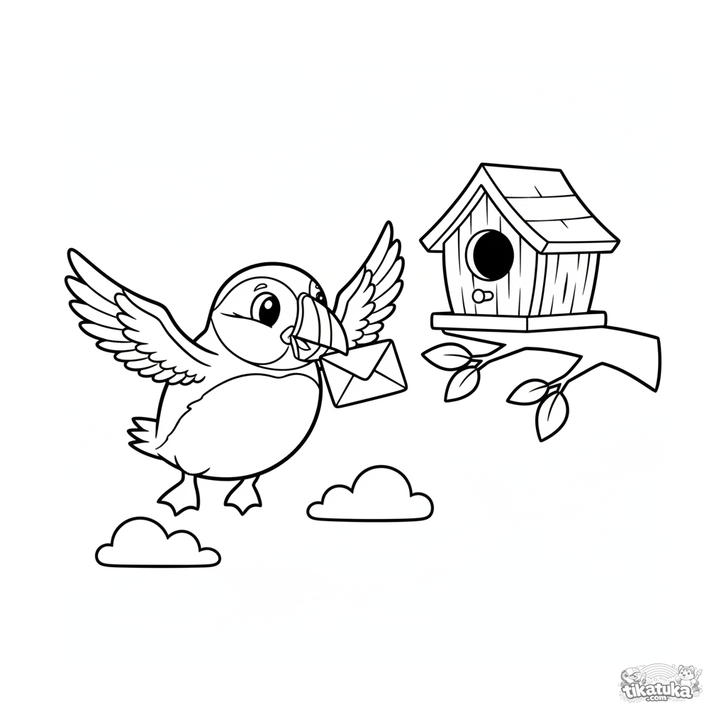Página para colorir para 4-6 anos em estilo cartoon anos 80: um papagaio-do-mar alegre voa para uma casa de pássaros para entregar uma carta. Cena vibrante.