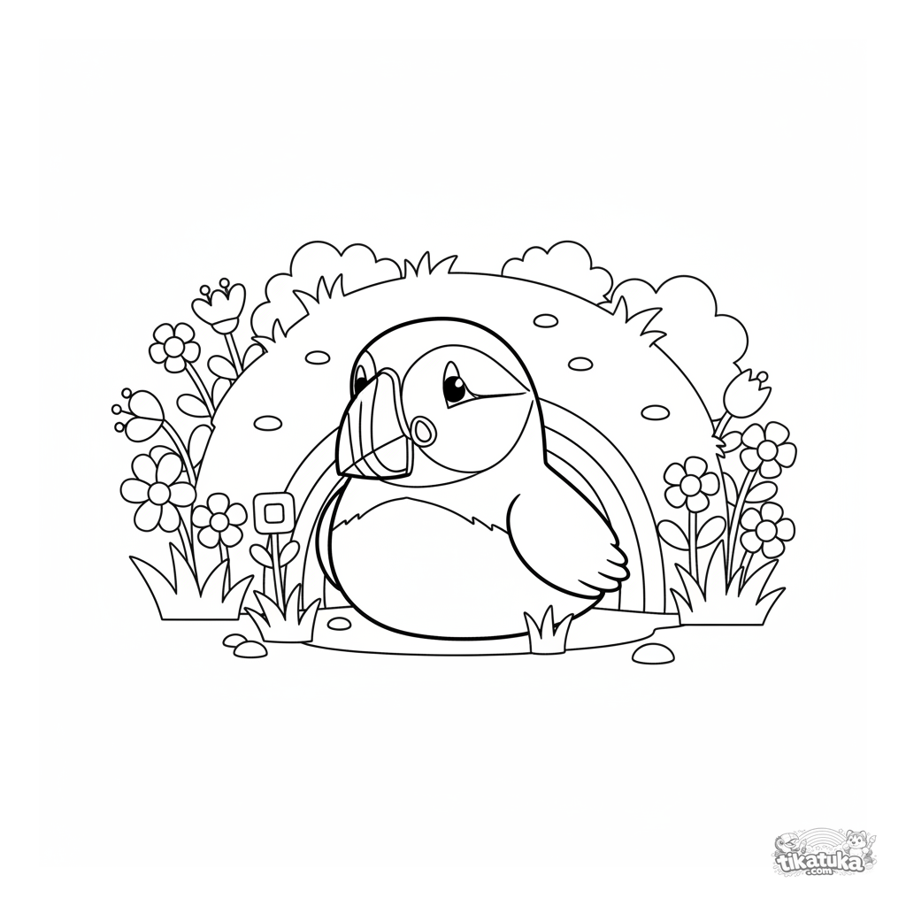 Página para colorir: um papagaio-do-mar espiando de sua toca de grama num prado florido. Para crianças de 4 a 6 anos, cena fofa.