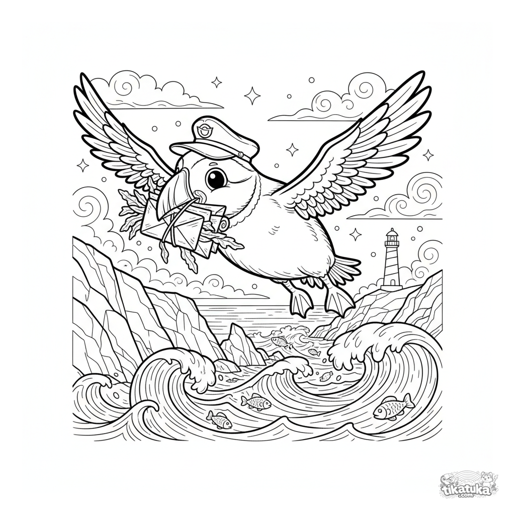 Página para colorir de um papagaio-do-mar carteiro sobre penhascos rochosos. Para crianças mais velhas de 7 a 12 anos. O pássaro de boné carrega cartas de algas, com um farol ao longe.