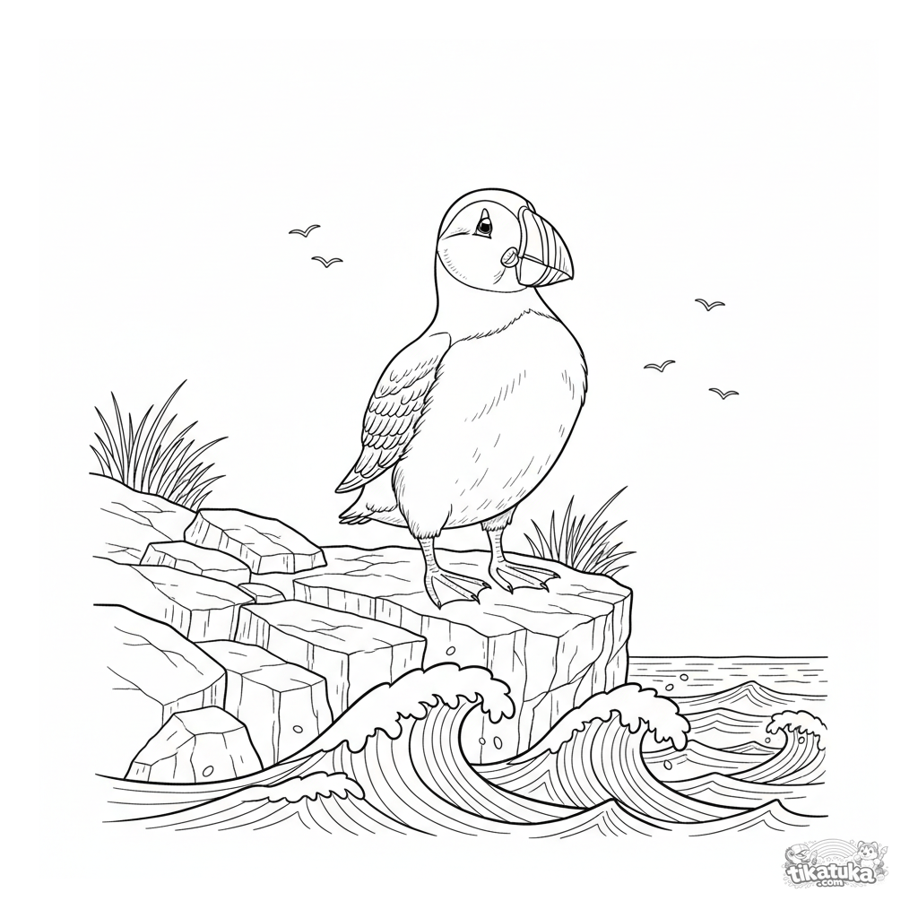 Página para colorir difícil para crianças de 7-12 anos: um papagaio-do-mar num penhasco rochoso. Alto detalhe e texturas para colorir.