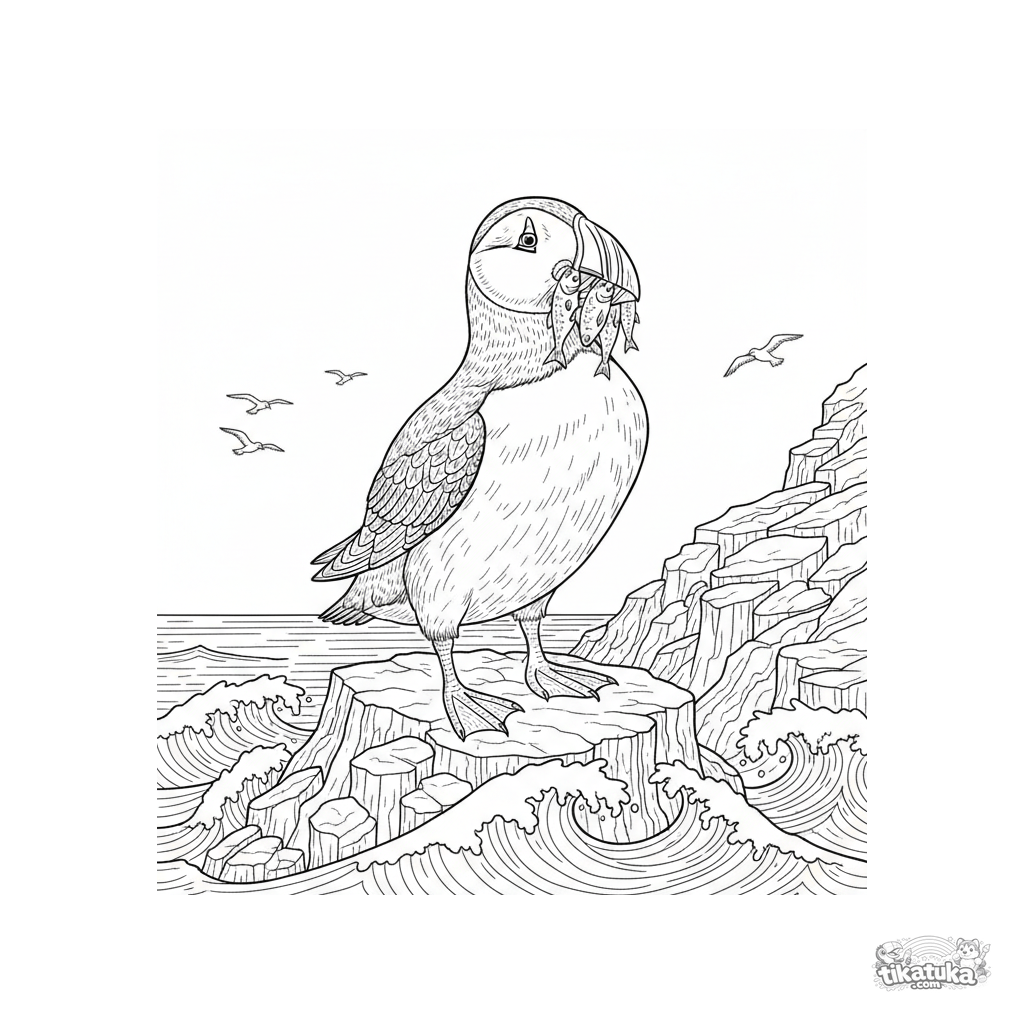 Página detalhada para colorir para crianças maiores de 7-12 anos com um papagaio-do-mar em um penhasco. Fundo intrincado com ondas e céu.