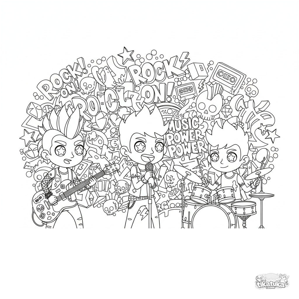 Página para colorir para crianças de 7-12 anos: uma banda punk-lite de três membros ensaiando em frente a um mural de graffiti. Cena detalhada com guitarra, microfone e bateria.