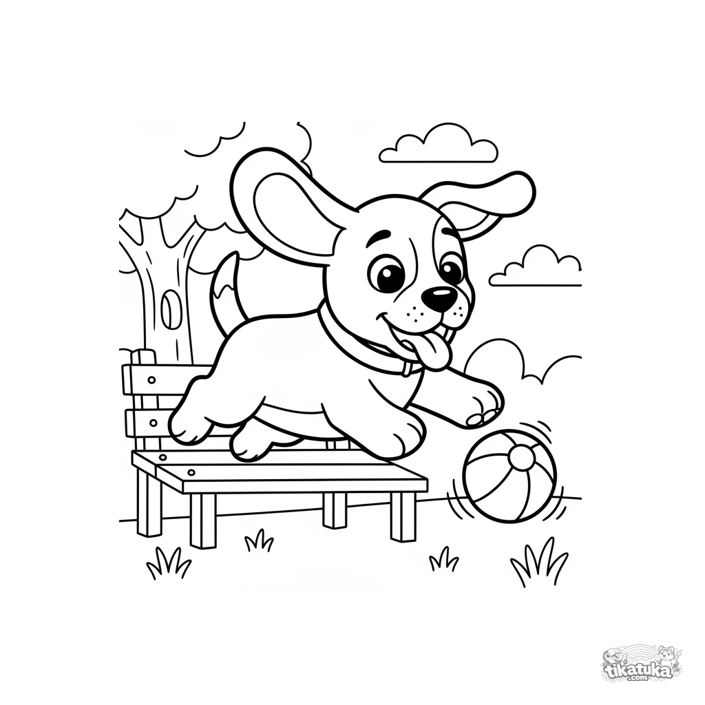 Página para colorir para crianças de 4-6 anos: um filhote de beagle feliz pula do banco perseguindo uma bola. Cena dinâmica e simples no parque.