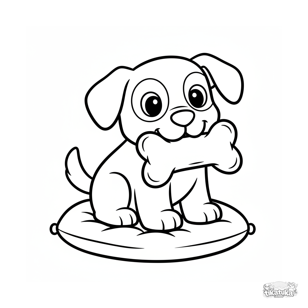 Página para colorir para os mais pequenos (2-3 anos): um filhote de cachorro feliz com forma de brinquedo de madeira senta em uma almofada segurando um travesseiro de osso. Formas geométricas simples.