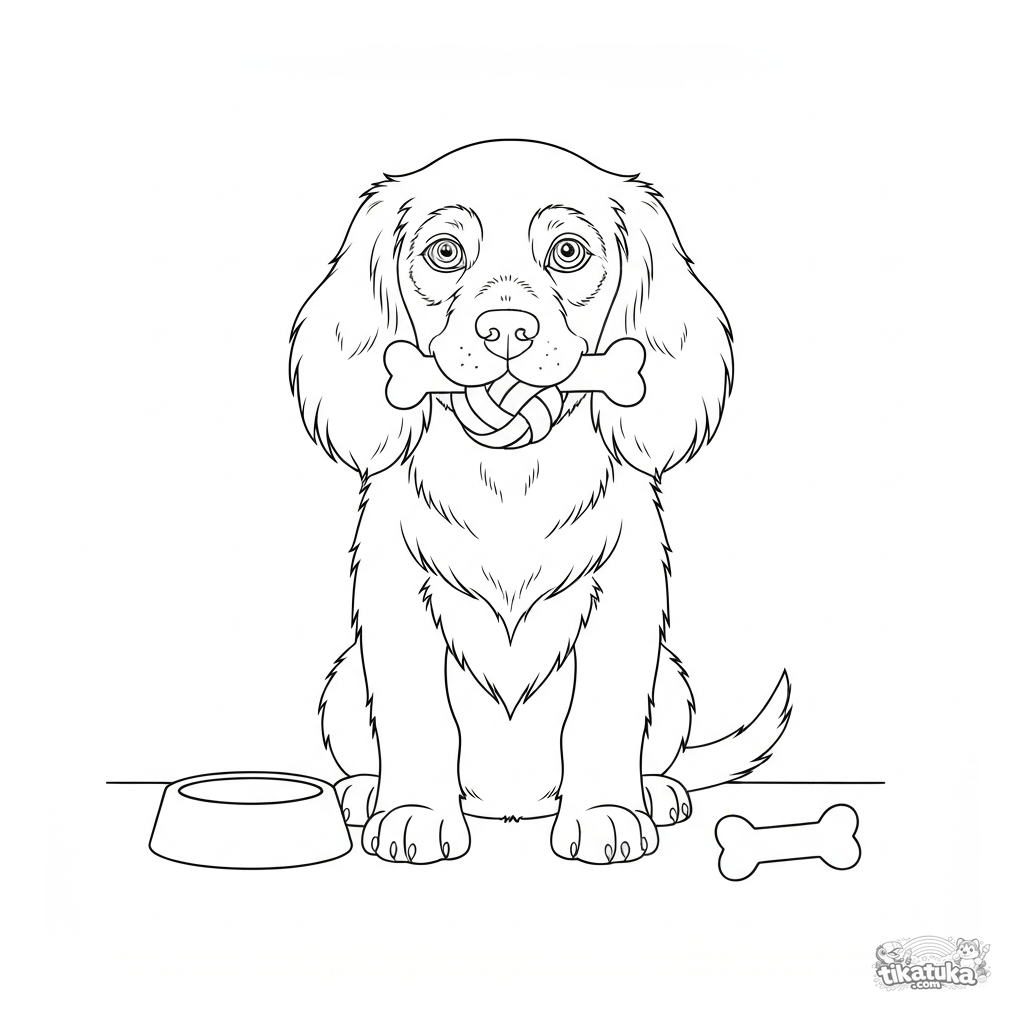Página para colorir de filhote estilo realista para 3-5 anos. Filhote com orelhas caídas segura um brinquedo, com uma tigela perto. Detalhes baixos.