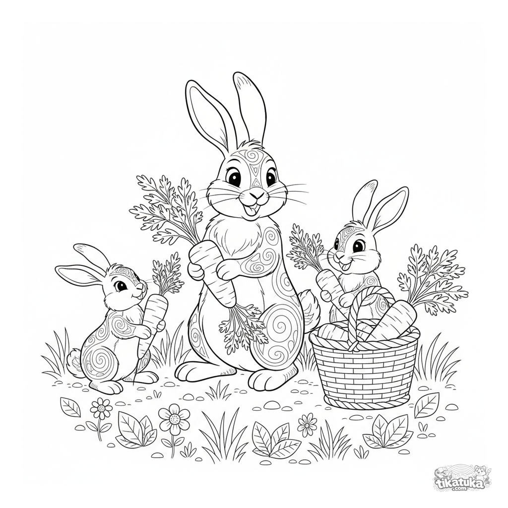 Página para colorir detalhada com tema familiar e outonal: coelhos trabalhando juntos para colher cenouras em um prado. Muitos detalhes, adequada para crianças 7-12.