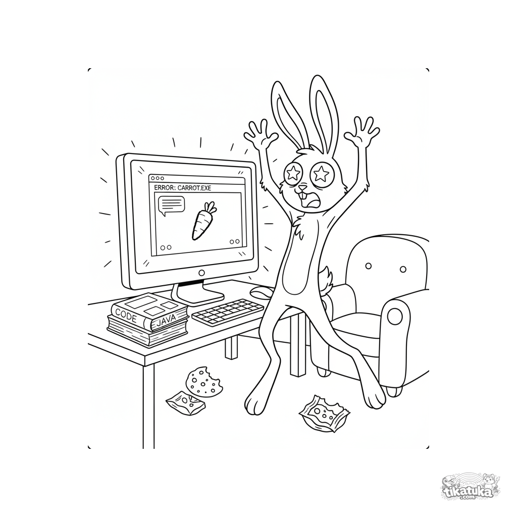 Página para colorir para crianças de 7 a 12 anos: um coelho fica chocado com uma falha no monitor de um computador em uma sala de chat. Cena com uma super reação dramática.