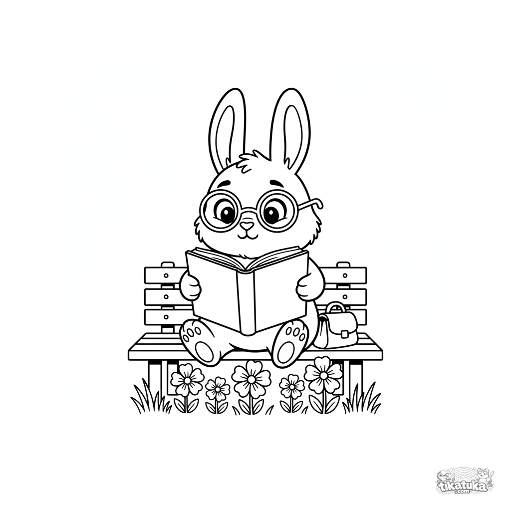 Página simples para colorir para crianças pequenas 2-3: um coelho fofo com óculos sentado no banco lendo um livro grande. Formas grandes, poucos detalhes.