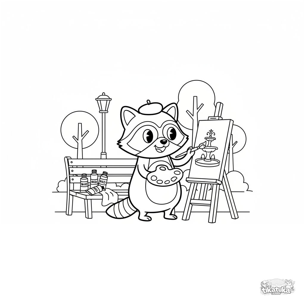 Página para colorir para crianças de 7-9 anos: um guaxinim de boina pintando em um cavalete. Pose dinâmica, estilo retrô.