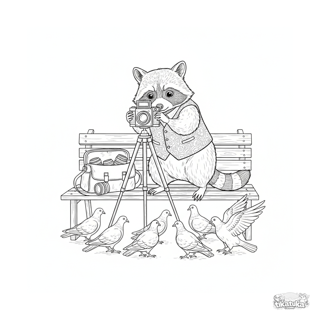 Página detalhada para colorir para crianças 10-12: um guaxinim fotógrafo com uma câmera antiga em um banco de parque. Estilo de gravura vintage.