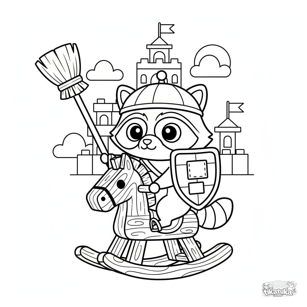 Página para colorir para meninos de 4-6 anos: o guaxinim Shmyak como cavaleiro em um cavalo de brinquedo.