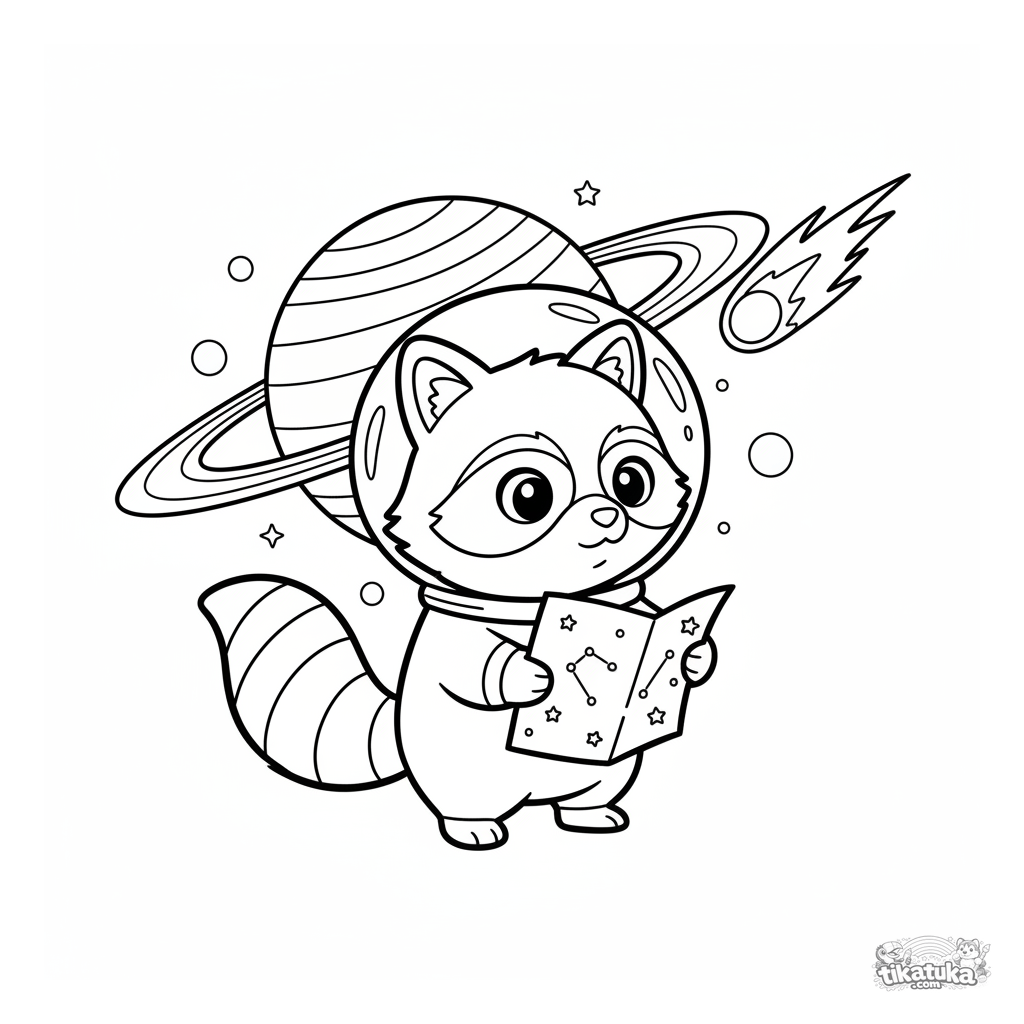 Página para colorir para crianças de 4-8 anos: o guaxinim inventor Shmyak em um traje espacial explora o espaço perto de um lindo planeta anelado.