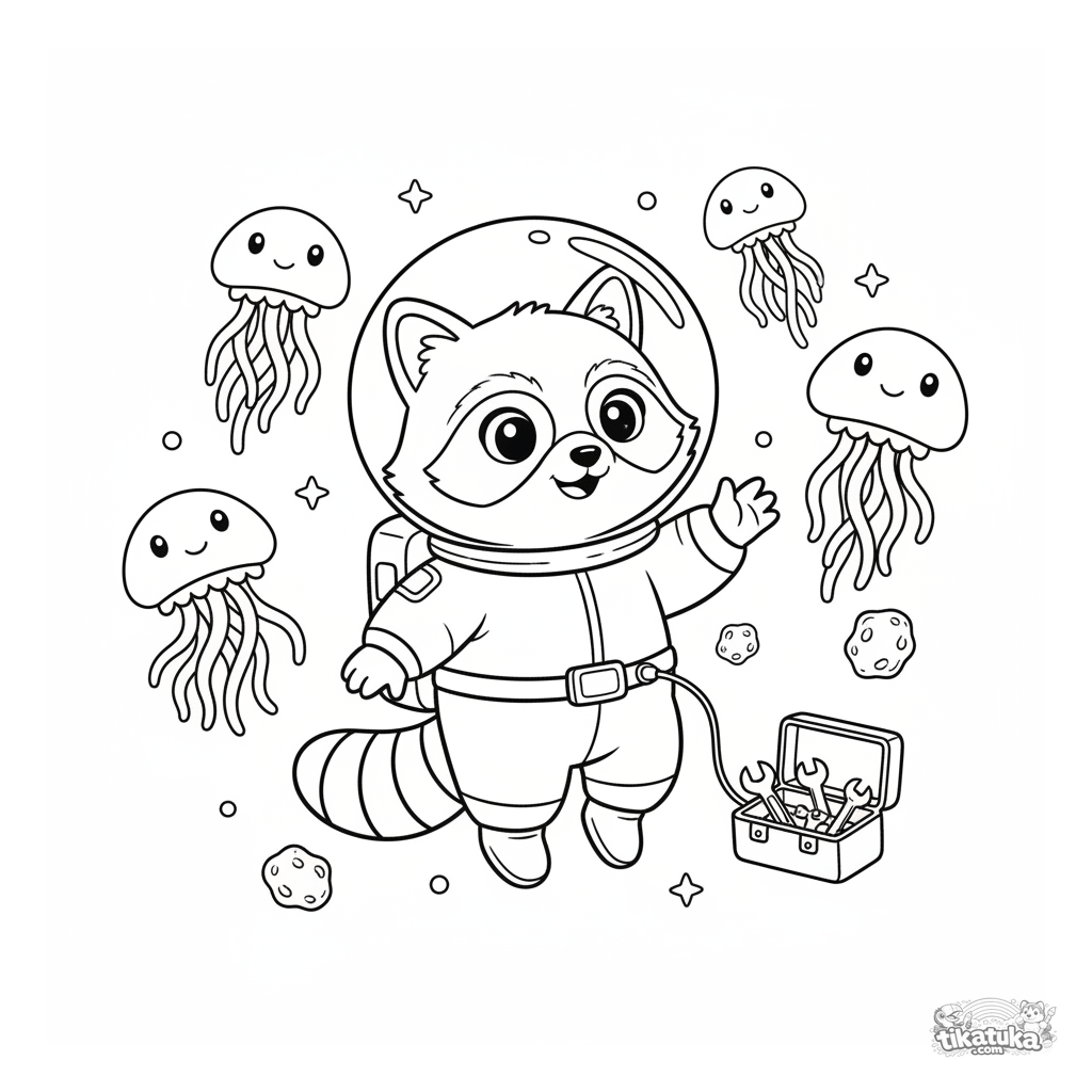 Página para colorir com o guaxinim inventor Shmyak como astronauta flutuando entre águas-vivas espaciais. Para crianças de 4 a 8 anos.