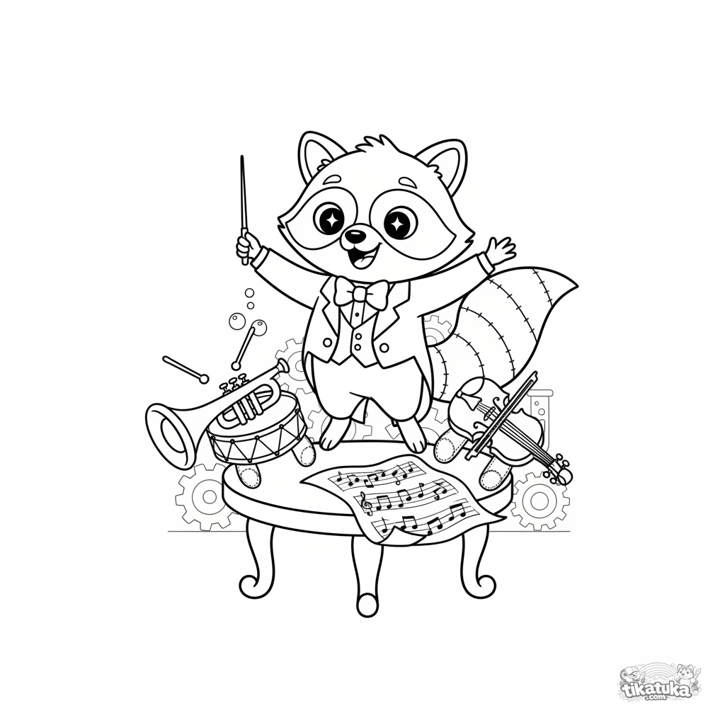 Página para colorir com o guaxinim maestro Shmyak regendo uma orquestra de brinquedos. Para crianças de 4 a 8 anos.