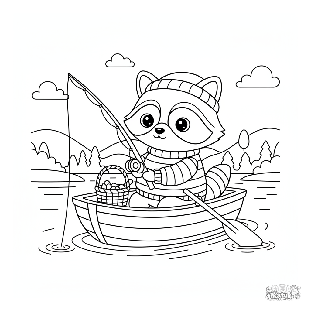 Página para colorir para crianças: o guaxinim Shmyak em um suéter listrado pesca de um pequeno barco a remos de madeira em um lago calmo. Cena pacífica, para 4-8 anos.