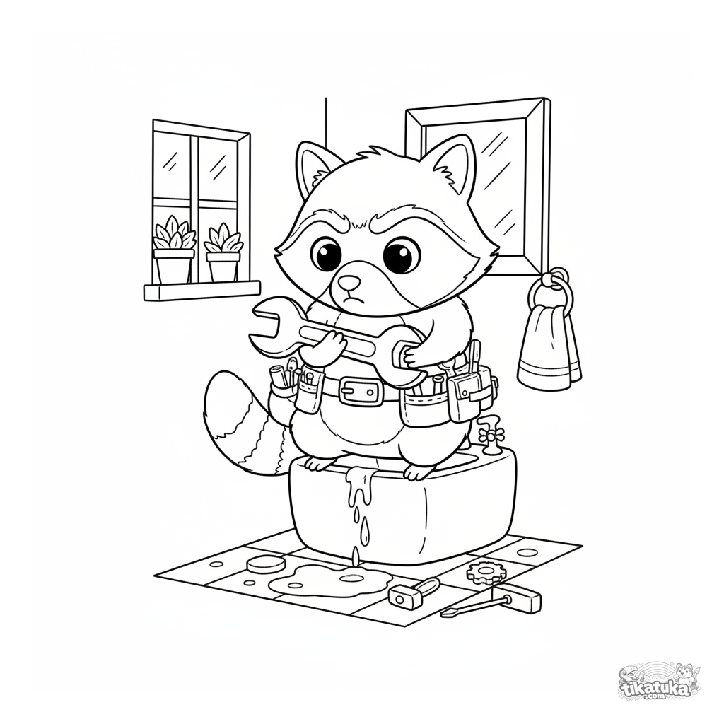 Página para colorir para crianças de 4-6 anos: o guaxinim faz-tudo Shmyak consertando uma torneira com vazamento no banheiro.