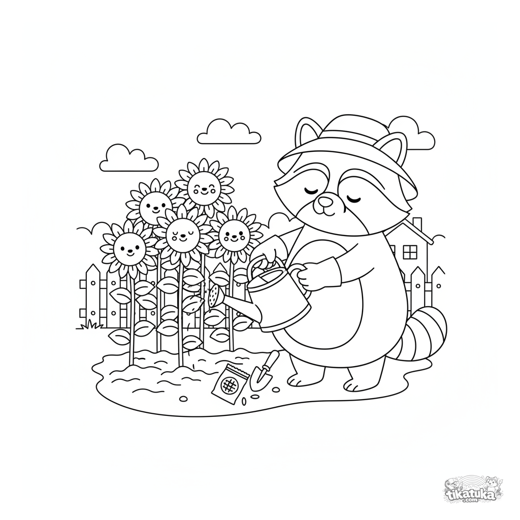 Página para colorir para crianças: o guaxinim Shmyak com luvas de jardinagem e chapéu rega girassóis altos em um jardim. Cena tranquila, formas simples, para 4-8 anos.