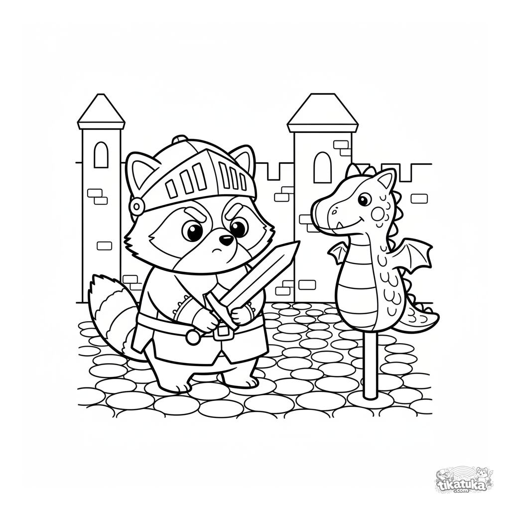 Página para colorir para meninos de 4-6 anos: o cavaleiro guaxinim Shmyak com armadura treina com uma espada de madeira contra um boneco de dragão de pelúcia.