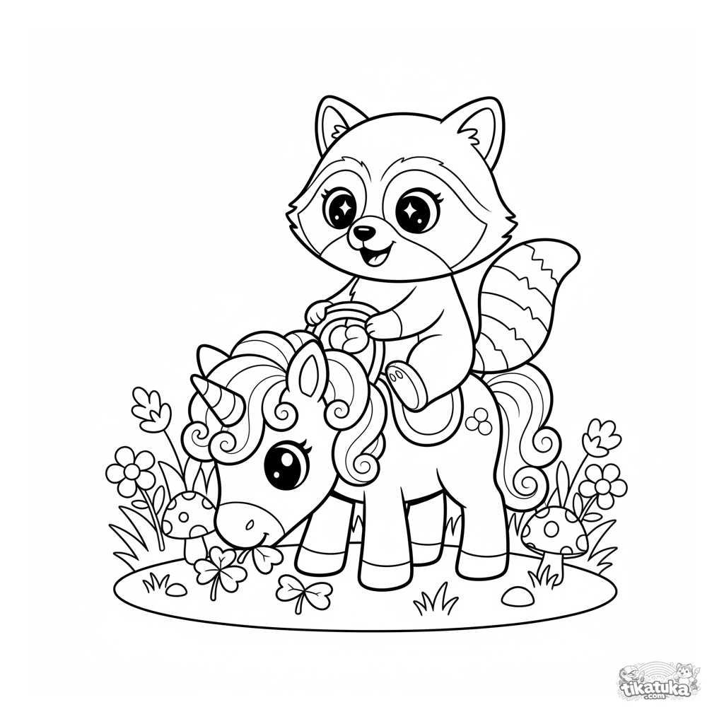 Página para colorir para meninas de 4-6 anos: o guaxinim Shmyak monta um pônei mágico e gentil com crina encaracolada em um prado florido.