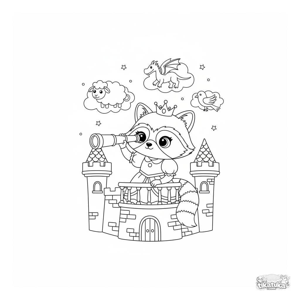 Página para colorir para meninas de 4-6 anos: a princesa guaxinim Shmyak com coroa olha através de um telescópio da varanda de um castelo de brinquedo.