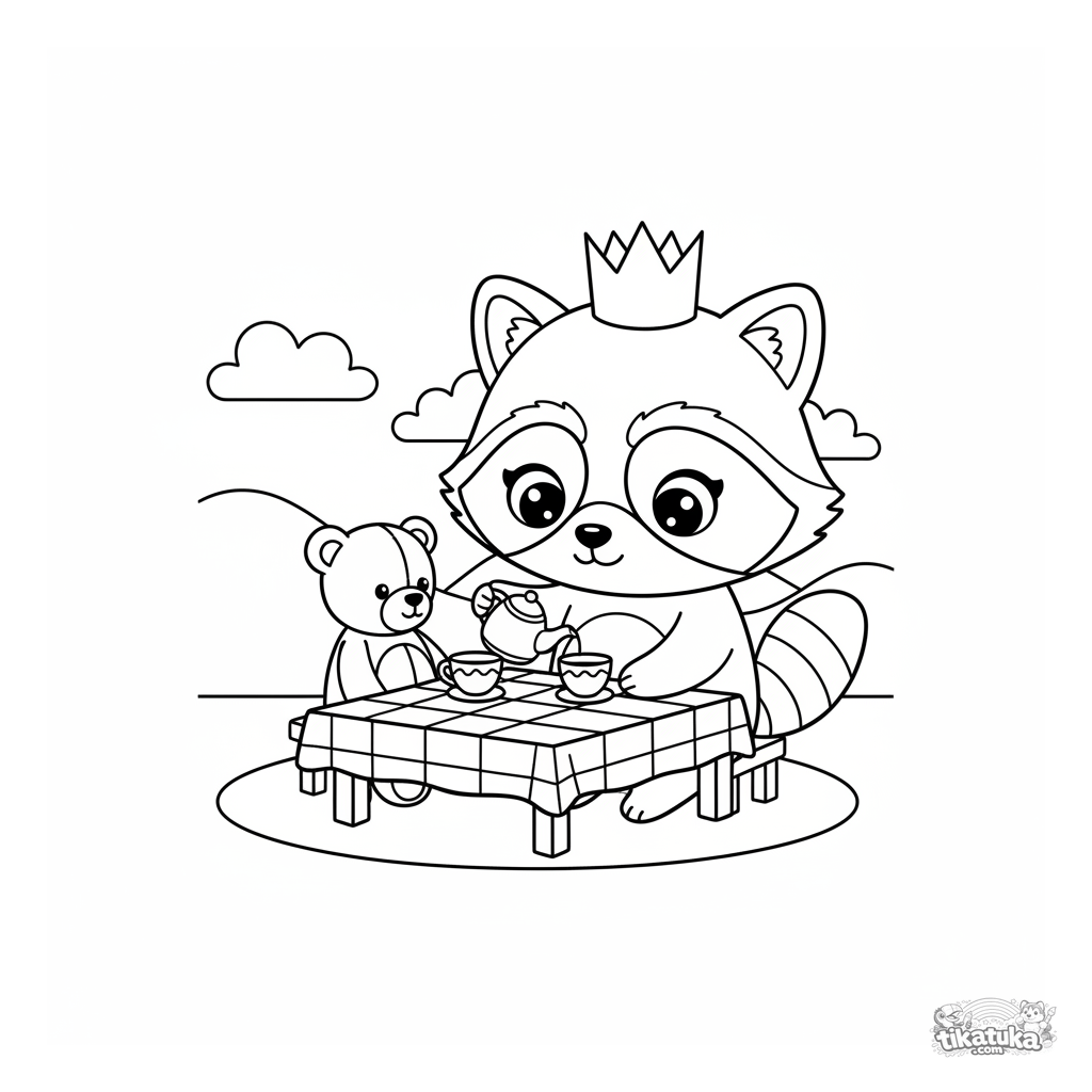Página para colorir para meninas de 4-6 anos: a princesa guaxinim Shmyak dá um chá da tarde para um urso de pelúcia. Cena fofa com coroa e bule de brinquedo.