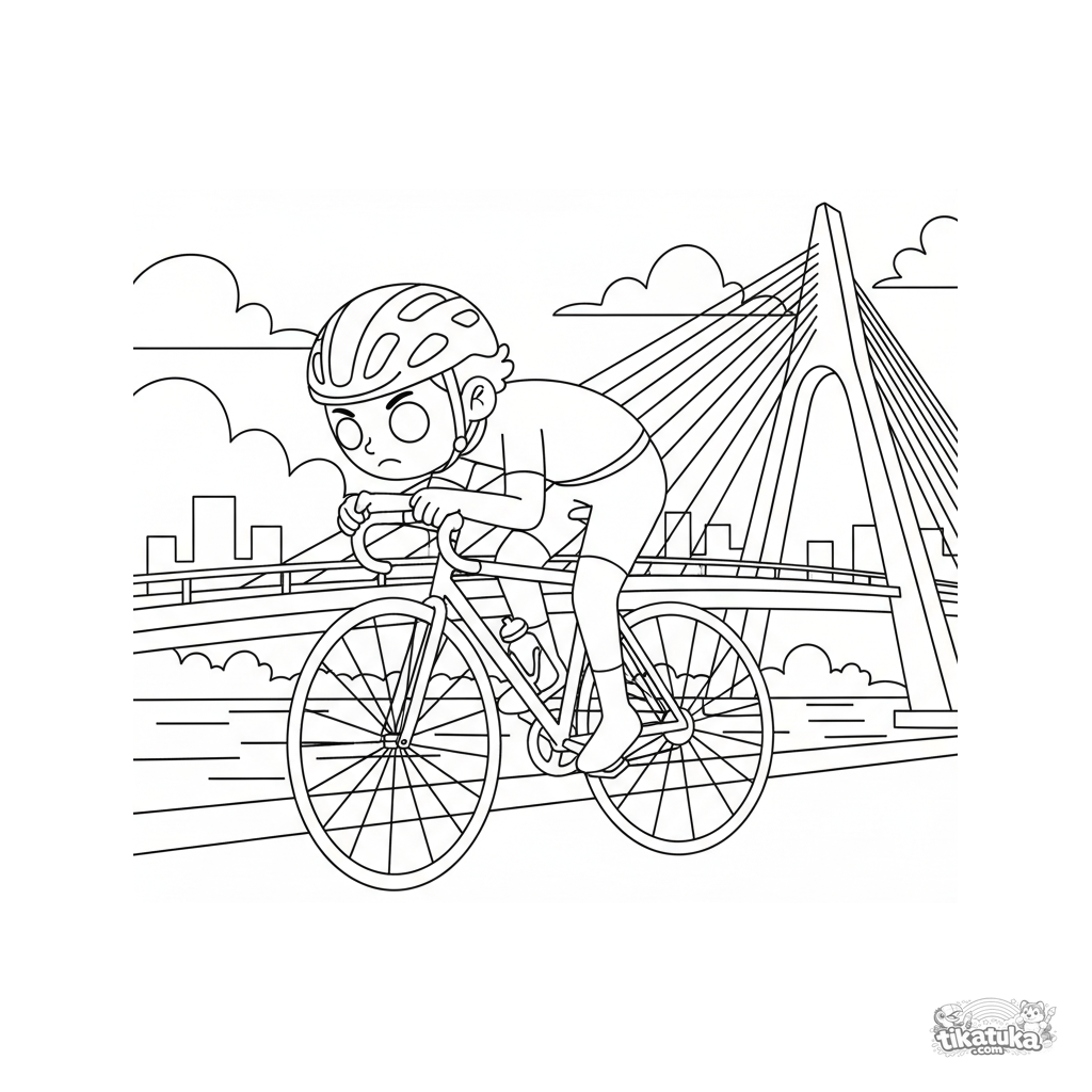 Página para colorir para pré-adolescentes 7-9: uma bicicleta de corrida cruza em velocidade uma ponte estaiada moderna sobre um rio. Ciclista em posição aerodinâmica.