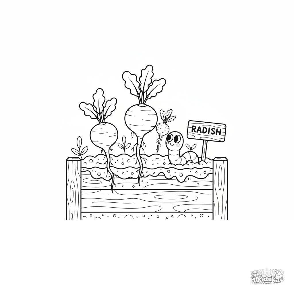 Página educativa para colorir para 7-9 anos: uma família de rabanetes crescendo no solo. Mostra raízes e solo em estilo de brinquedo de madeira.