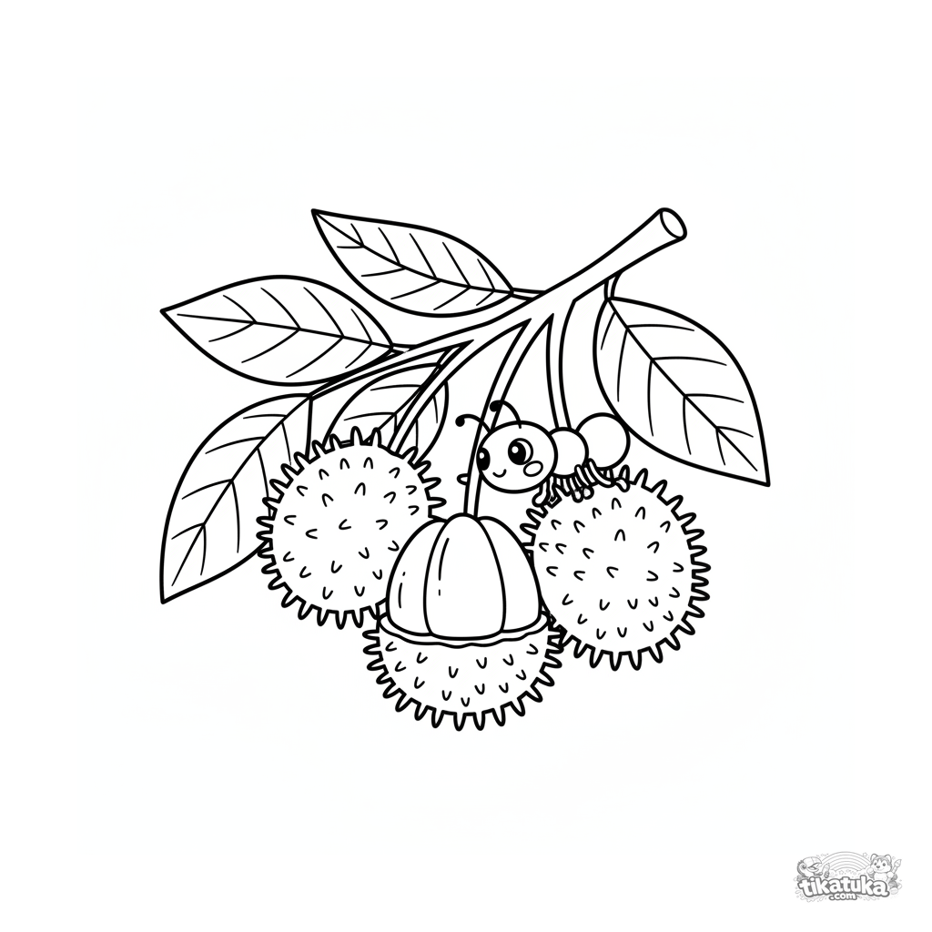 Página para colorir para crianças pequenas: um galho com rambutãs espinhosos e uma formiguinha amigável. Formas grandes e simples, margens amplas.
